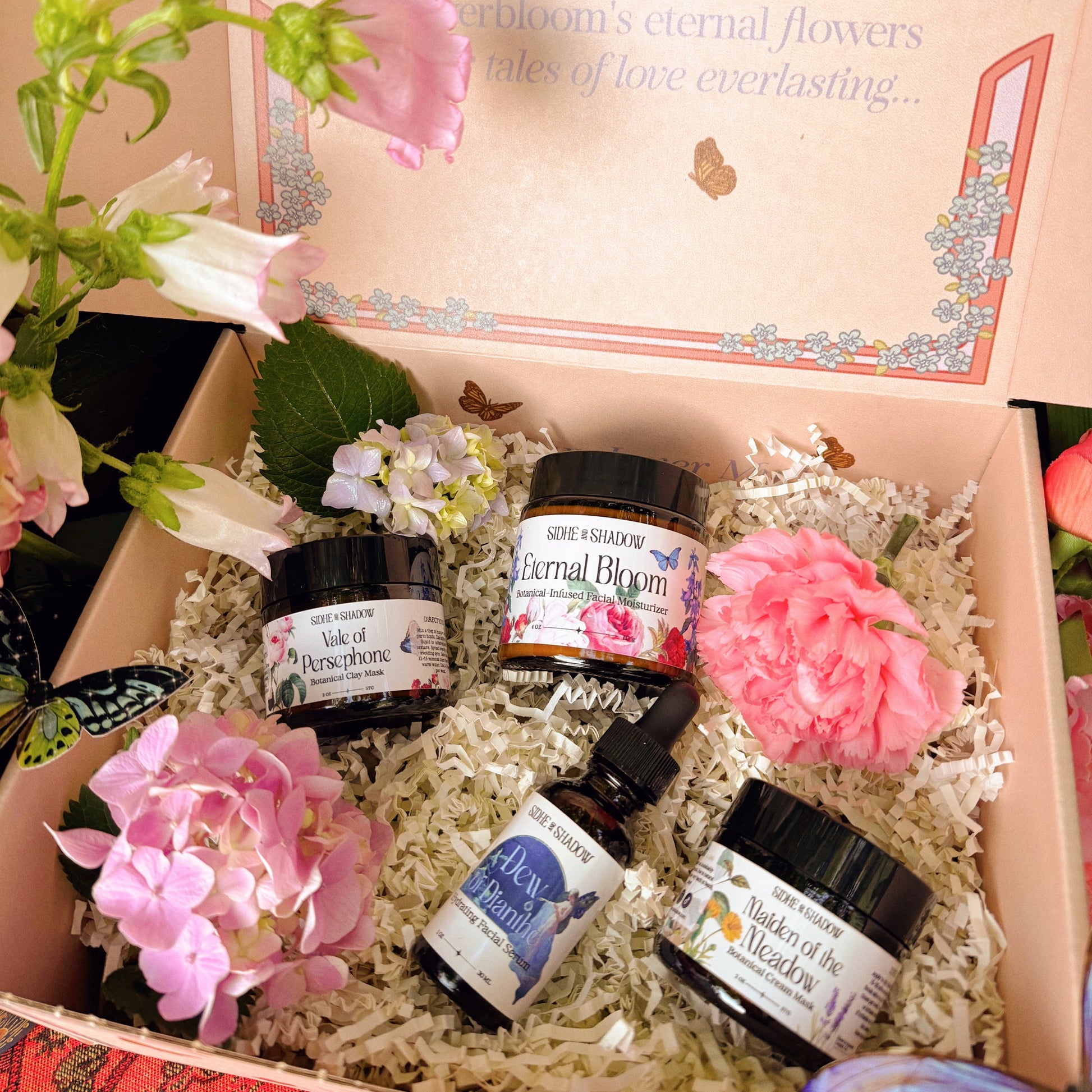 Inside this beautifully illustrated vintage book-inspired box, you will find a curated selection of our finest botanical skincare treasures, each telling a story of its own.